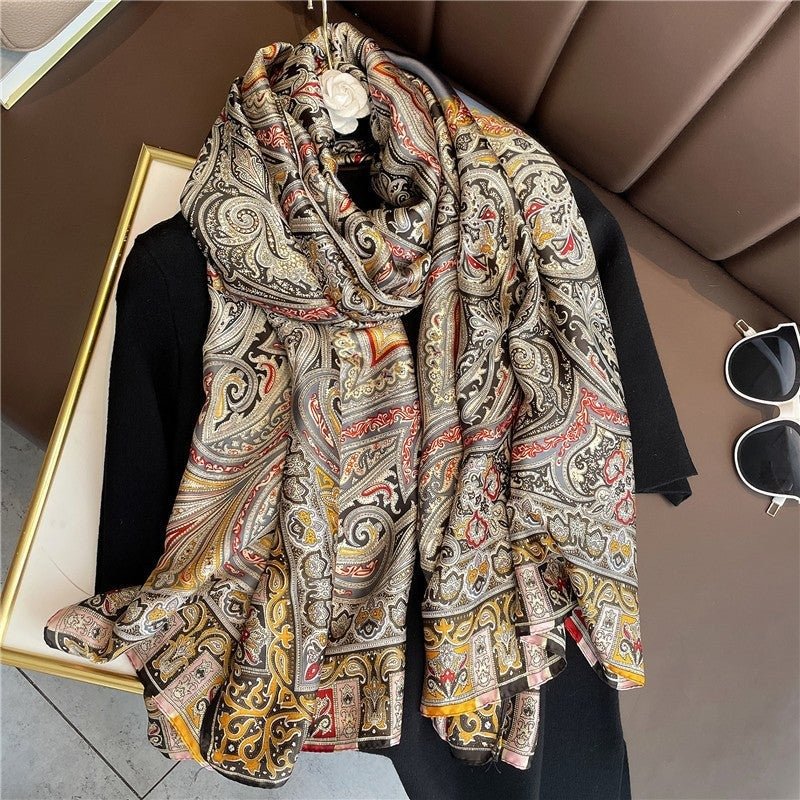 A vibrant silk scarf with intricate patterns, ideal for adding a pop of color to your ensemble.